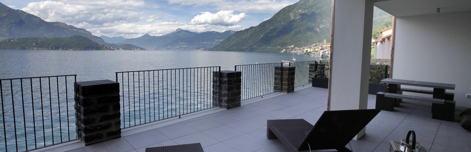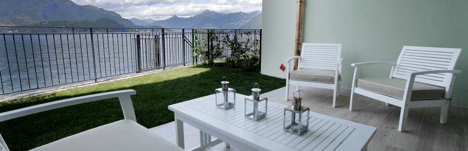 In un giardino a lato delle abitazioni, una piscina, con annessi servizi e accessori complementari, si affaccia direttamente sul lago e sulla spiaggia privata sottostante, in una grande continuità visiva con lo specchio d'acqua. Qui le lastre quadrate 60x60 Multiquartz disegnano il bordo ispirandosi alla pietra naturale, garantendo al tempo stesso grande resistenza al calpestio. I terrazzi privati sono stati realizzati con il sistema bilastra DUE Marazzi, finitura superficiale SistemN Grigio Scuro Bocciardato.