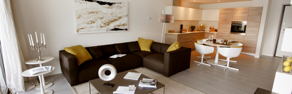 Il progetto ha cercato di rispettare i caratteri del luogo, ispirandosi ai materiali e agli elementi tipologici del contesto locale, con particolare attenzione al tema della sostenibilità e del risparmio. Lo stesso sistema di riscaldamento e produzione di acqua calda sanitaria prevede infatti l'utilizzo di pompe di calore che utilizzano l'acqua del lago, così da escludere il ricorso a combustibili negli appartamenti interni. A livello di finiture, il progetto nel suo complesso ha deciso di affidarsi a quattro tipologie principali di materiali: vetro per le aperture e i parapetti di alcuni terrazzi, pietra naturale per soglie, davanzali e scale di accesso al lago, ferro per i parapetti di alcuni loggiati e terrazzi con disegno ”tipico lombardo”. Per pavimenti e rivestimenti interni si è scelto di affidarsi a grés e ceramica esclusivamente Made in Italy. Negli appartamenti esclusivi, dall'arredo raffinato e dai colori minimali, Marazzi ha messo a disposizione le essenze ispirate al legno di Treverkhome e Treverksign, così come le superficie raffinate ed essenziali di SistemN color Sabbia. Nelle stanze da bagno, la linea Suite, ispirata al marmo, è caratterizzata da una superficie lucida e da vari decori, floreali e geometrici; le lastre formato 18x36 cm intendevano assegnare agli ambienti una certa ricercatezza di stile.